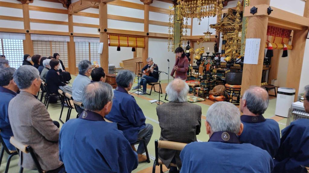 多可町八千代区中野間にある天台宗 伊勢和山 極楽寺で、妻と共に演奏をしながら講演会をさせていただきました。曲の間に話をするというスタイルは初めてでしたが、檀家の皆さんが熱心に耳を傾けてくださいました。